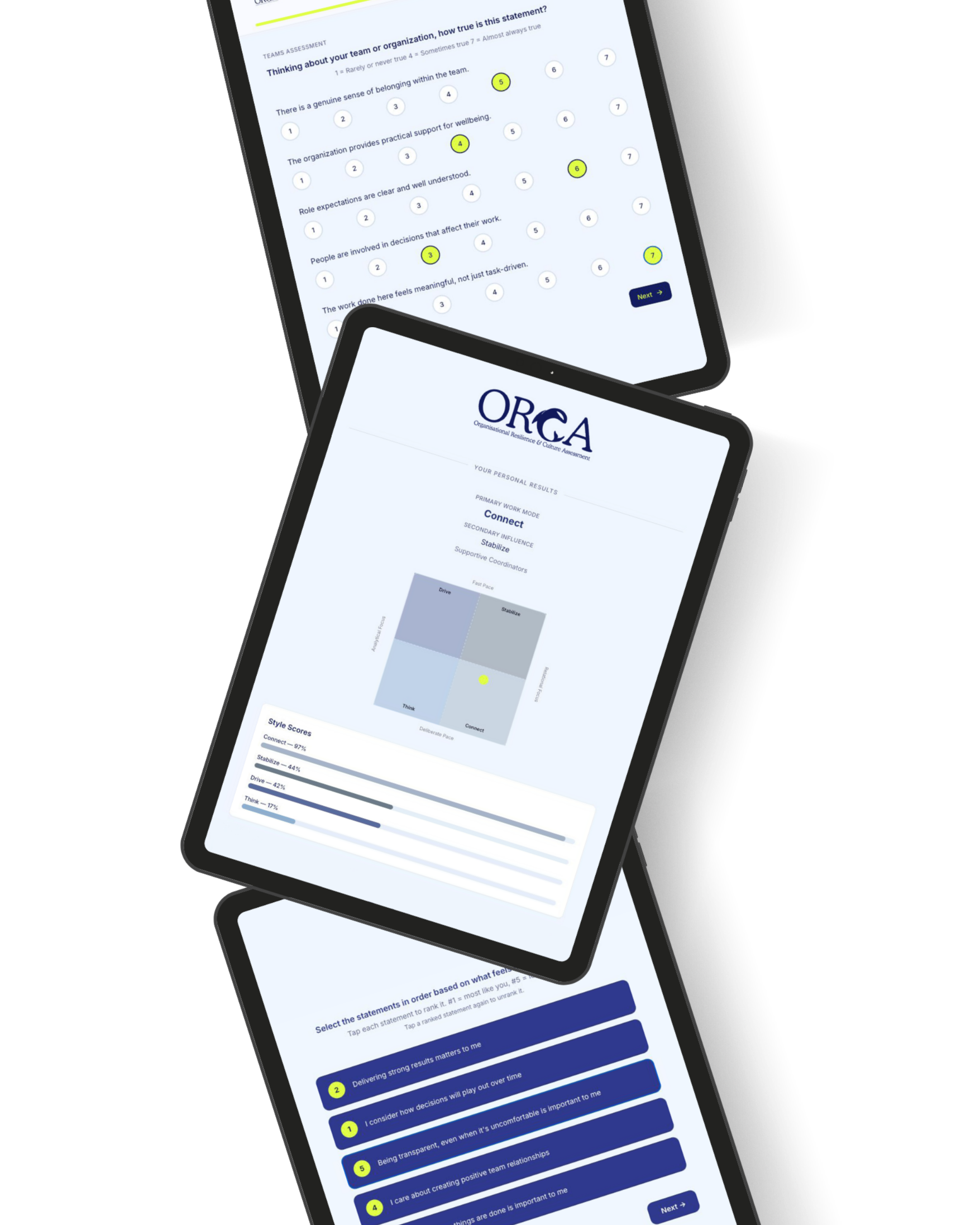ORCA is a multi-dimensional framework designed to understand how people operate at both an individual and team level, and how these interact within the wider organisational system.